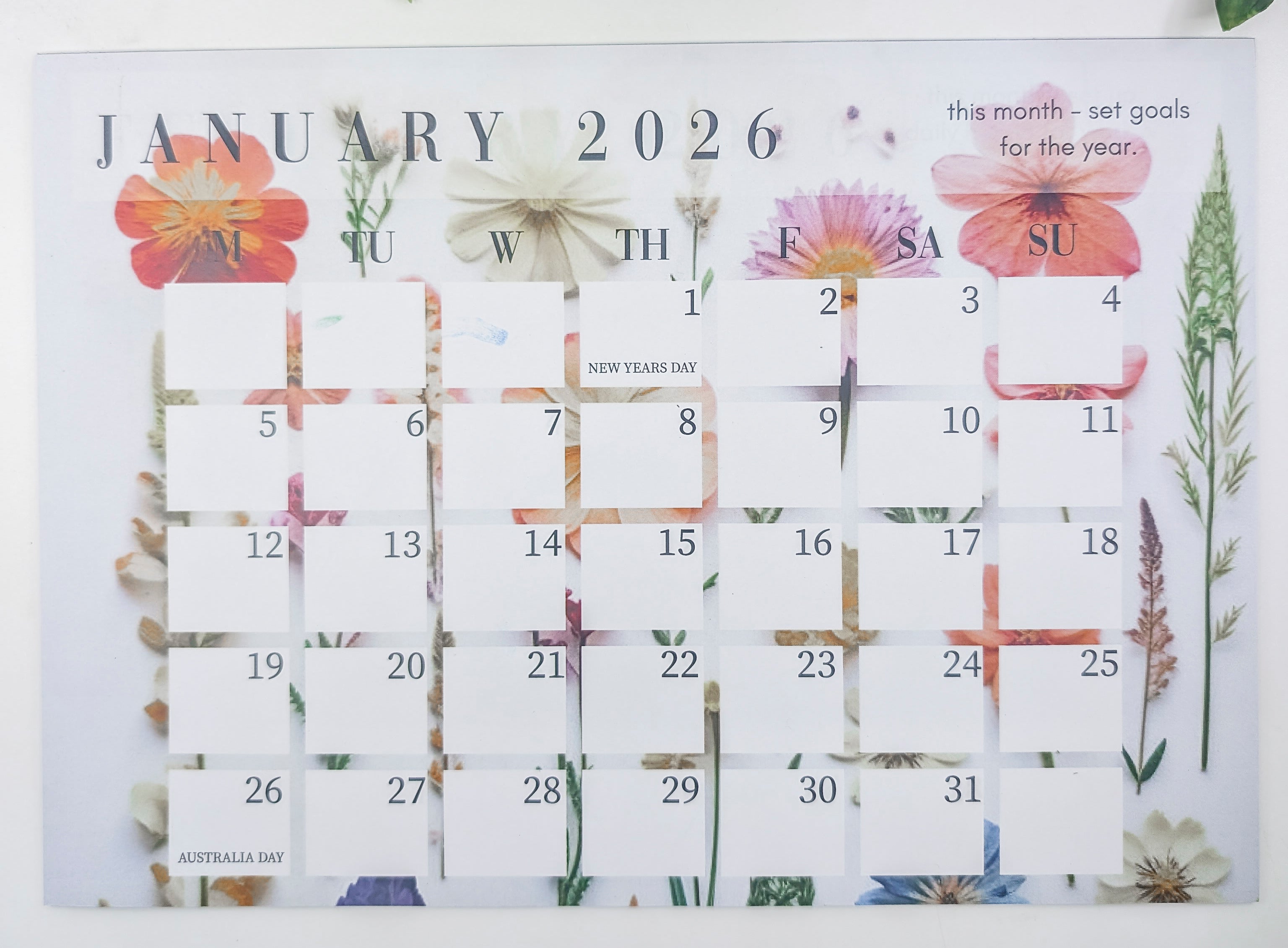 This A4 desk notepad features floral photography and beautiful big boxes to write down what you have on. There's also a monthly prompt to focus on one task (goal setting, connection with others, etc). Printed on 100gsm paper.